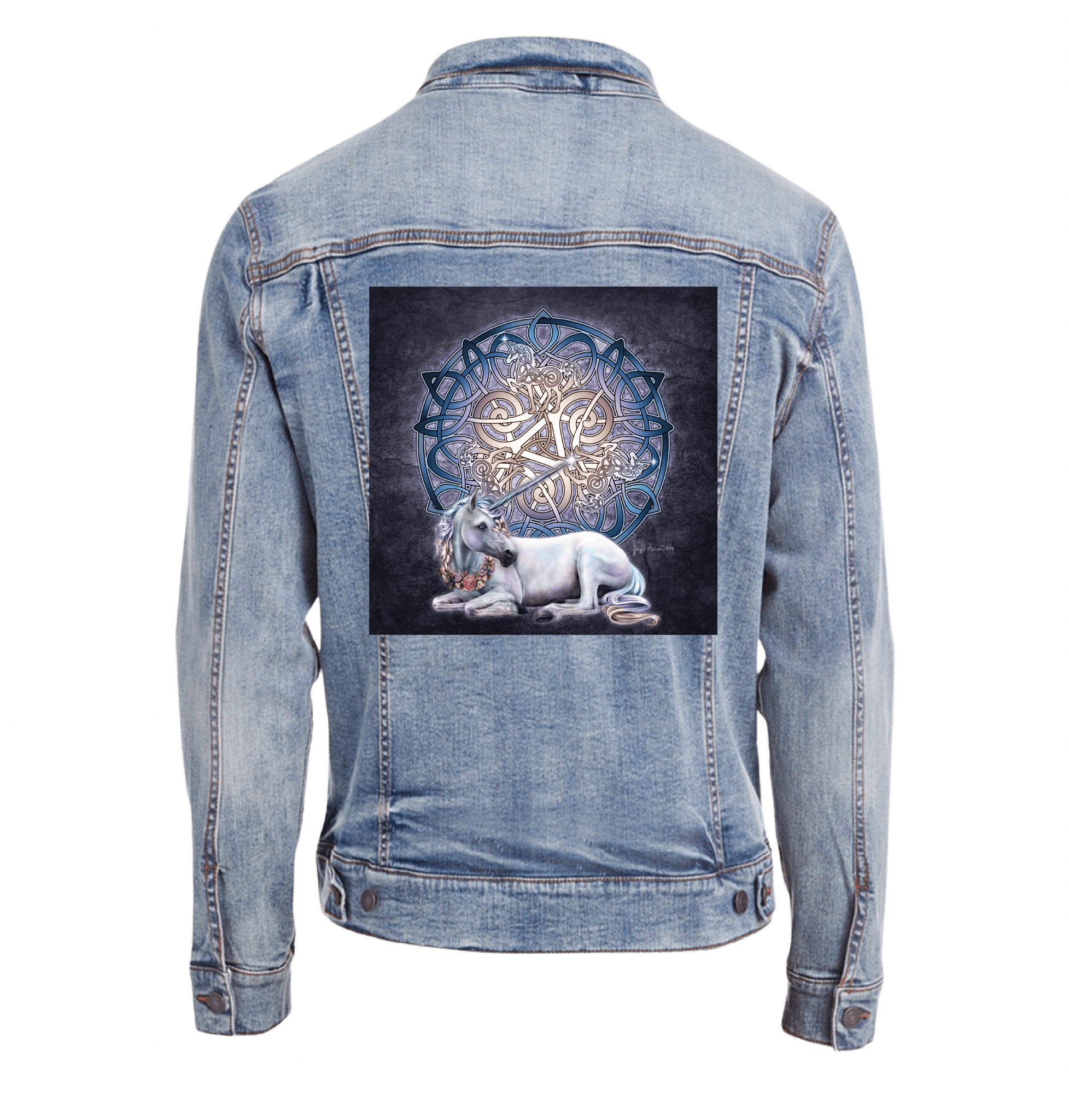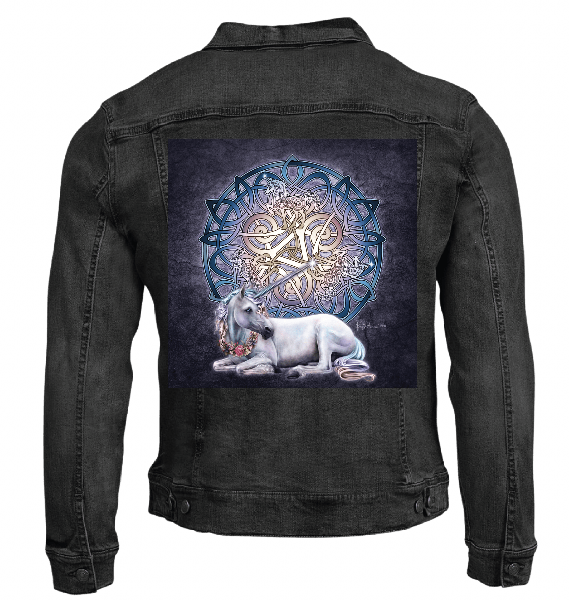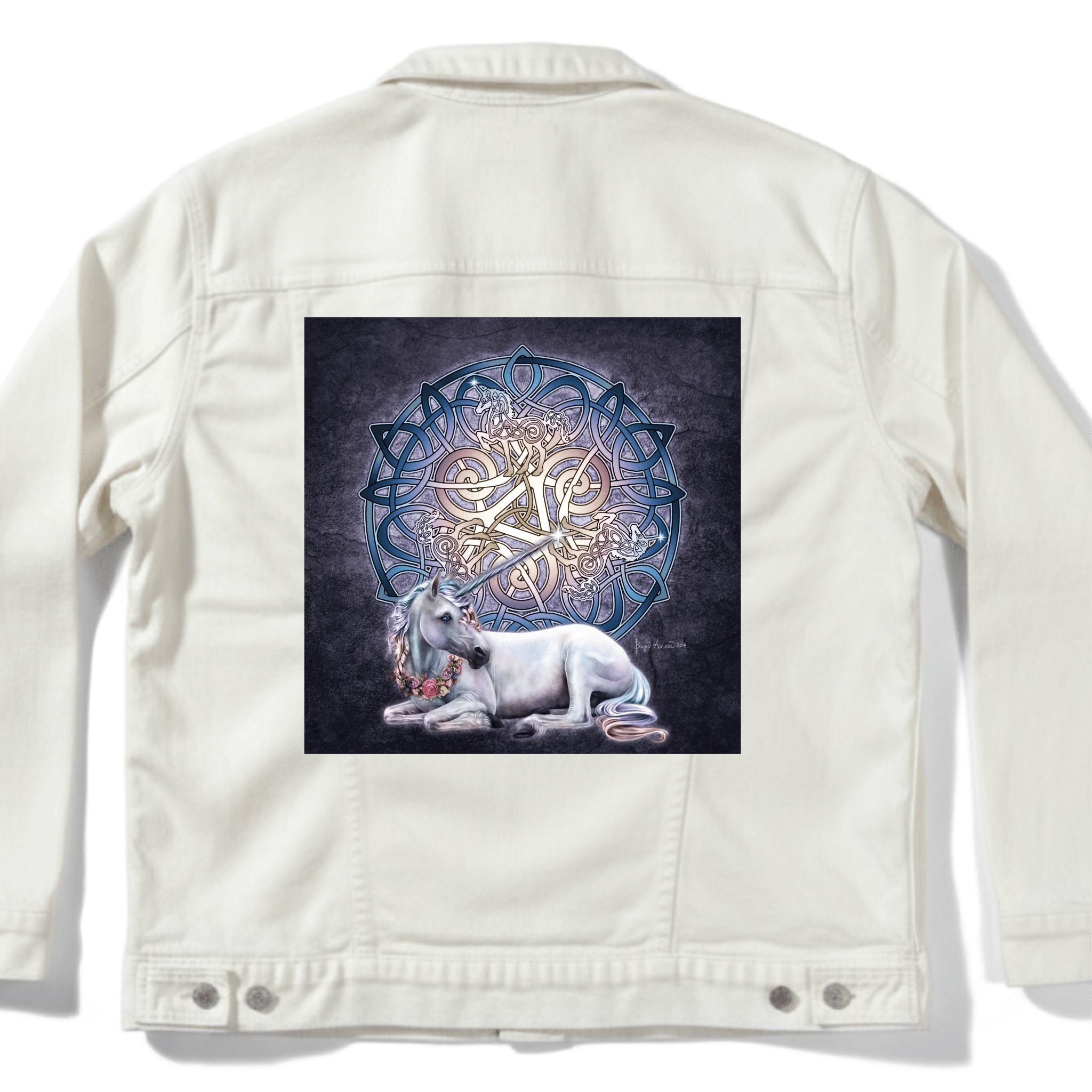 “Celtic Unicorn with background” by Brigid Ashwood Digitally printed by DenimINK on your choice of denim products: unisex jackets XS-3X, fleece-lined jackets, tote bags, throw pillows, table placemats, aprons. Ships Worldwide. Hand-crafted in USA. CELTIC UNICORN with background by BRIGID ASHWOOD
