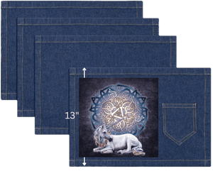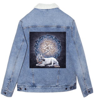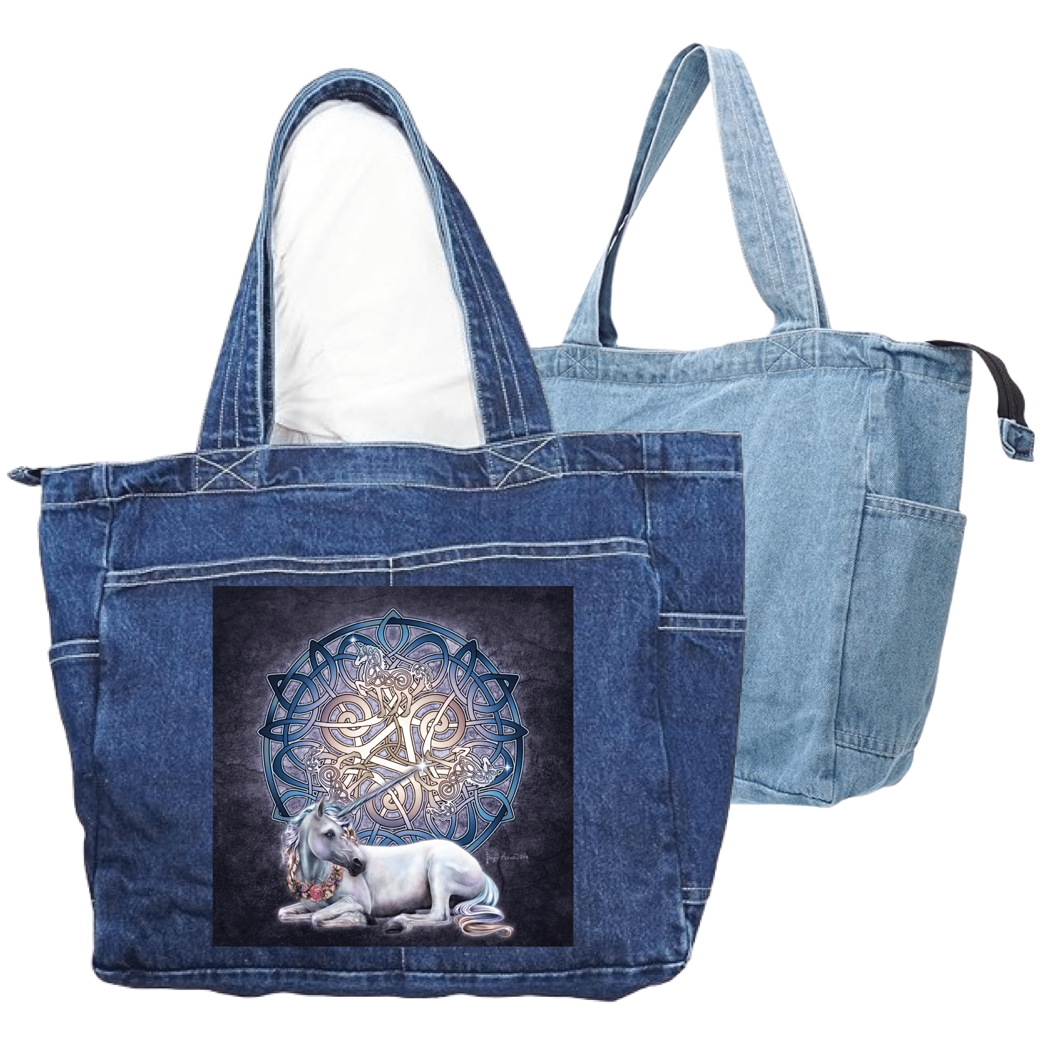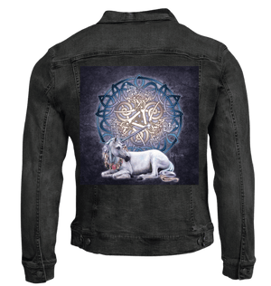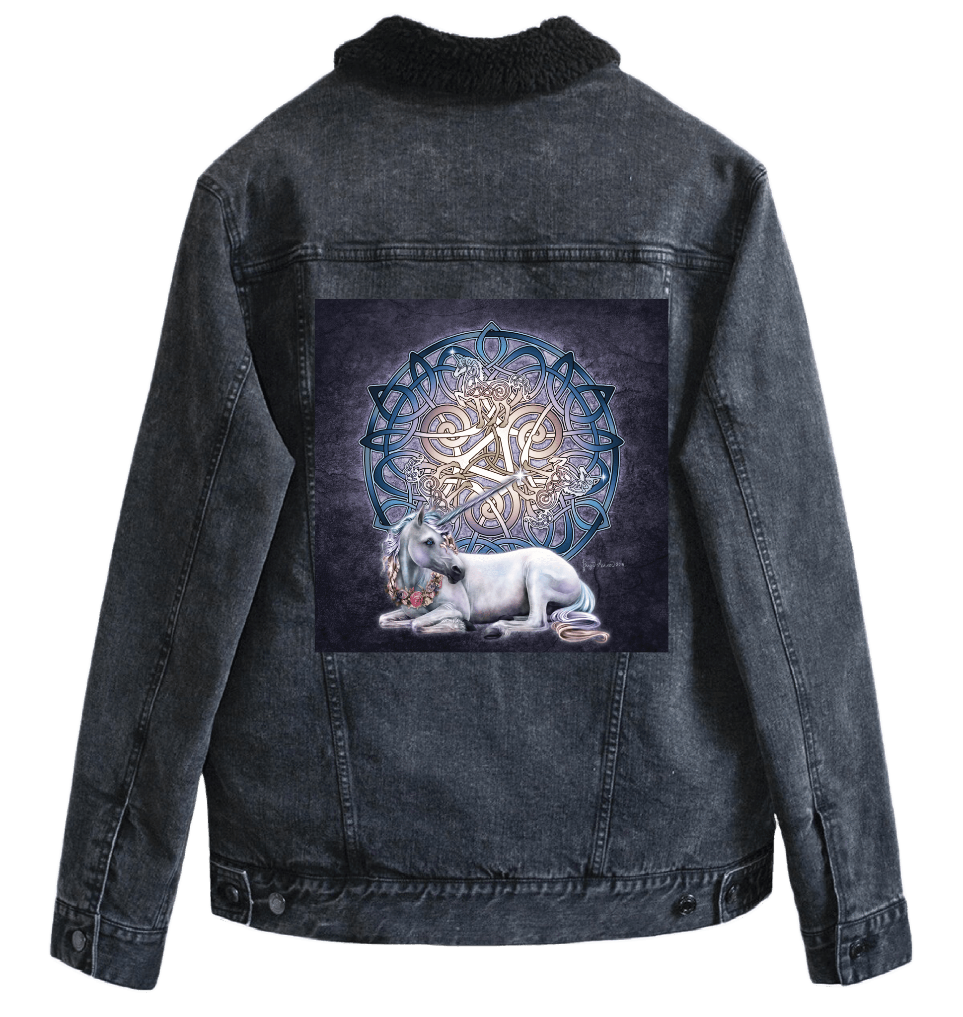 “Celtic Unicorn with background” by Brigid Ashwood Digitally printed by DenimINK on your choice of denim products: unisex jackets XS-3X, fleece-lined jackets, tote bags, throw pillows, table placemats, aprons. Ships Worldwide. Hand-crafted in USA. CELTIC UNICORN with background by BRIGID ASHWOOD