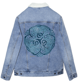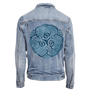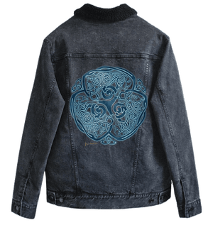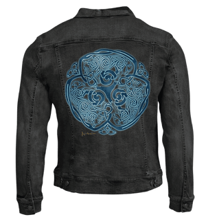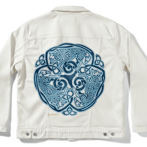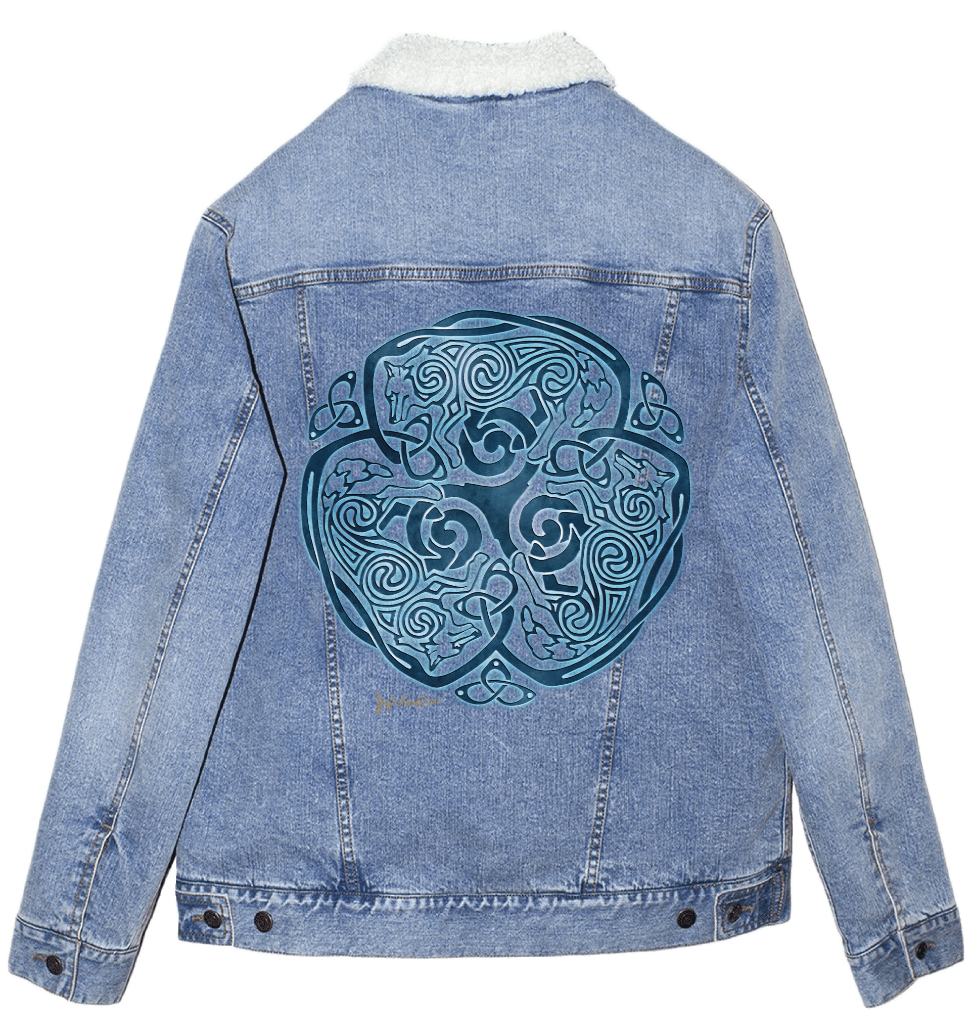 cues make the wolves feel woven, not outlined. On denim, that hierarchy becomes