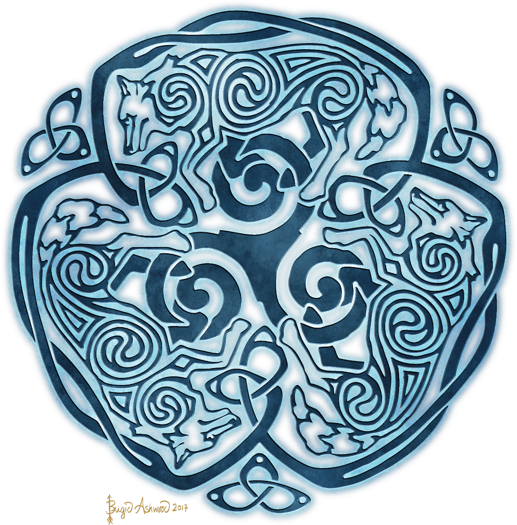 composed of interlocking spirals and woven lines. three stylized wolves are