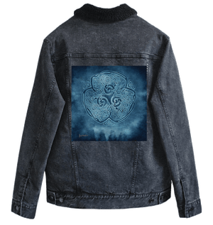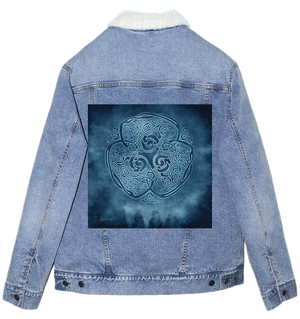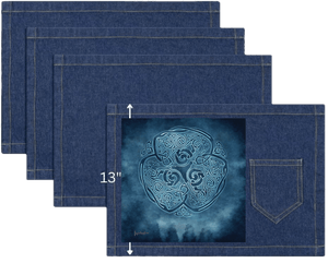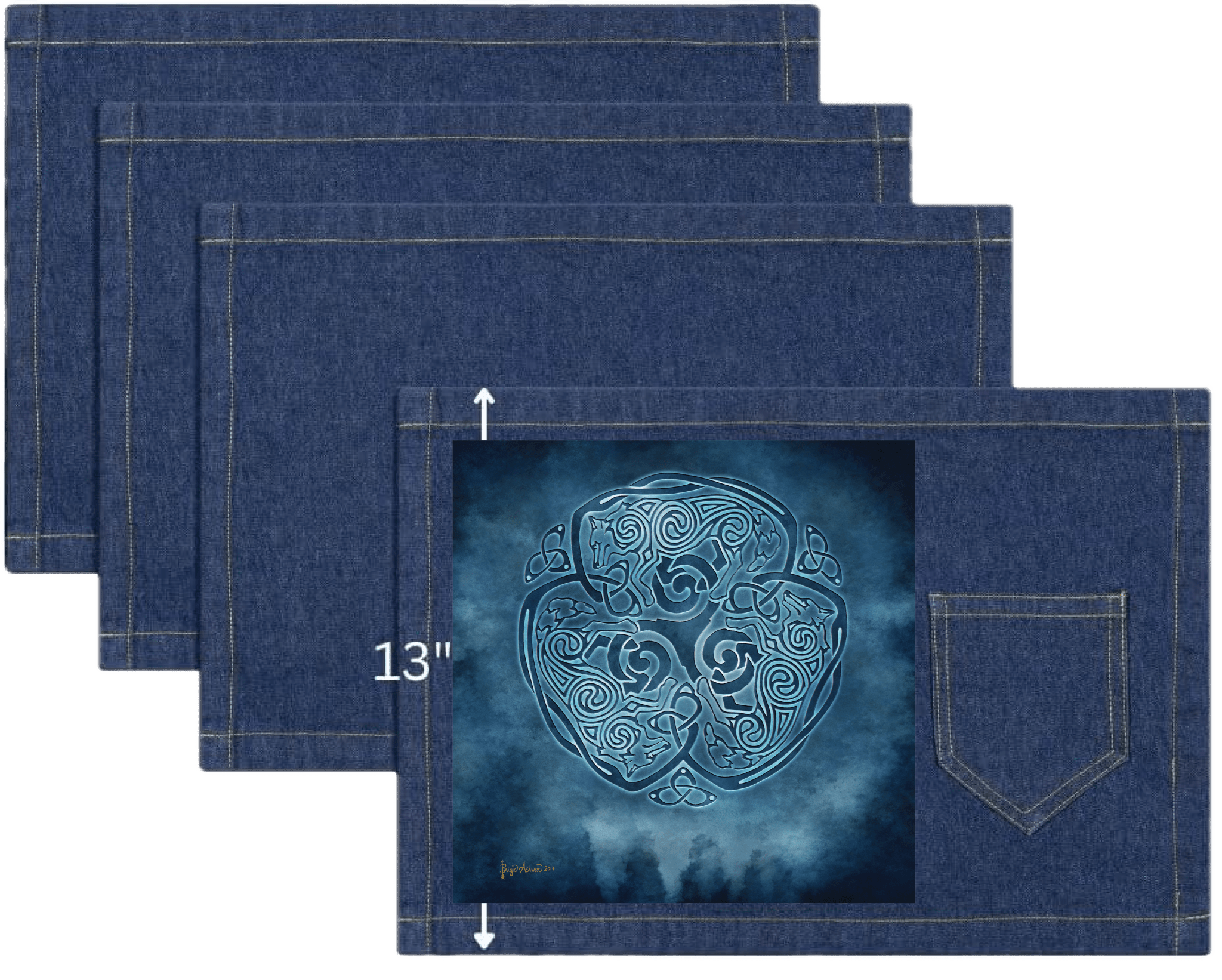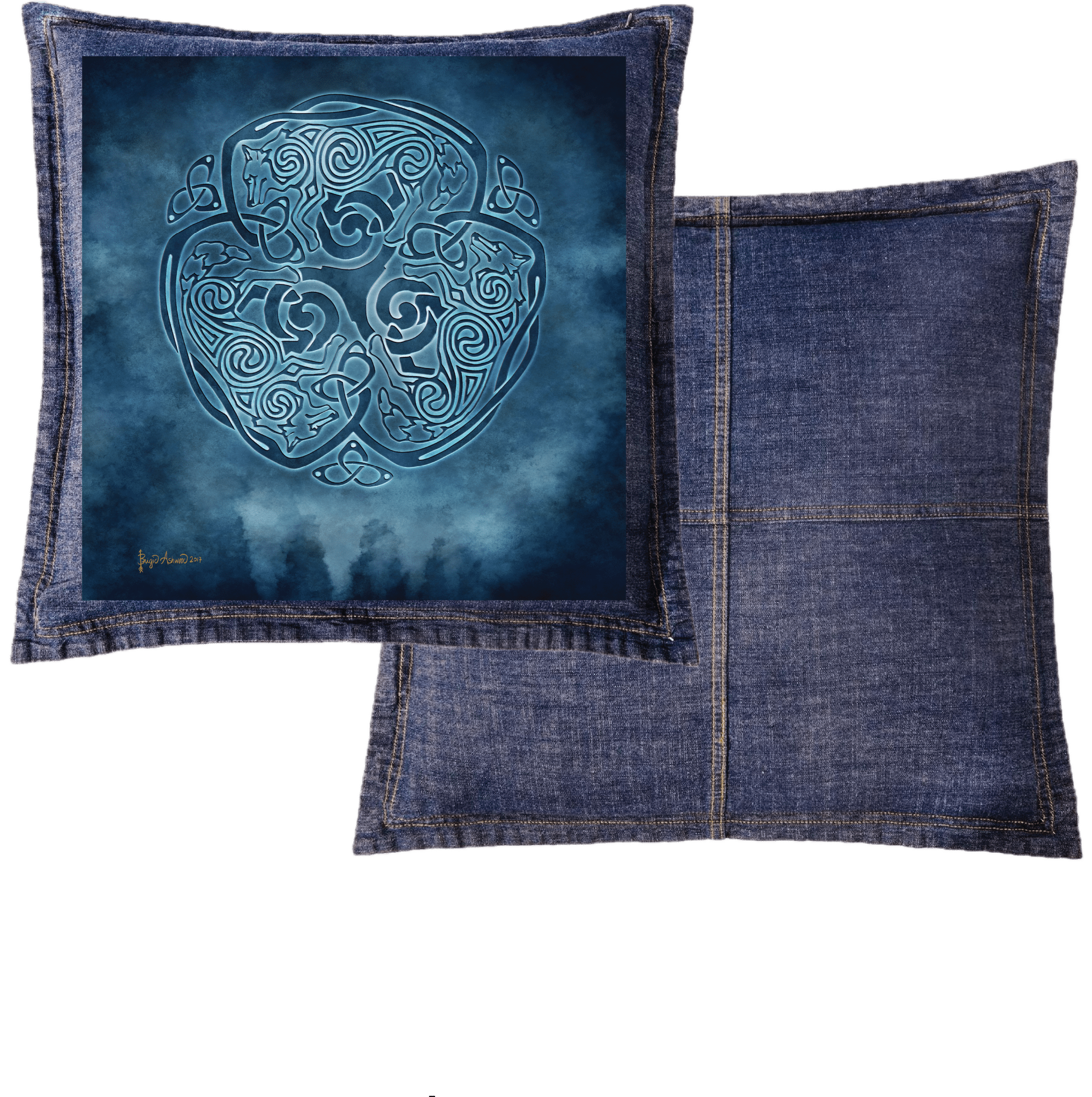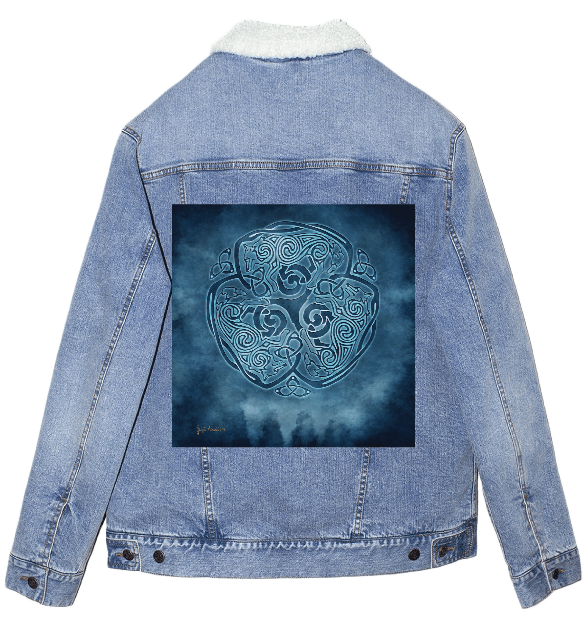 knotwork softens slightly against the faded blue-gray fabric, creating the