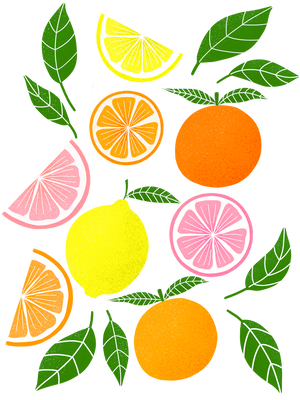 Color is the driving force of the artwork. Bright yellow, orange, and pink citrus tones contrast sharply against the black background, while the green leaves provide visual cooling between warm elements. Texture appears through fine speckling across the fruit surfaces and subtle grain within the citrus flesh, giving the illustration a tactile, print-like quality.