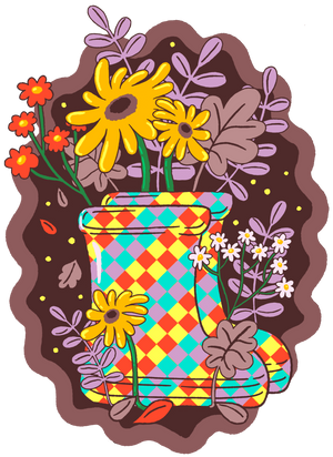 illustration of A colorful rain boot used as a flower vase, filled with yellow daisy-like flowers and surrounded by smaller red, white, and brown blossoms. The boot features a bright diamond pattern in teal, yellow, orange, and pink with a curved handle on the right. layered leaves in muted purple and brown tones surround the boot on a dark brown background with scattered yellow dots. This artwork is titled “Colorfall Season Boots” and created by INDYSIGN