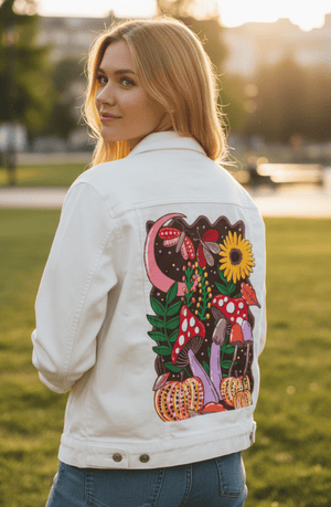 COLORFALL SEASON SHROOMS AND MOTHS by INDYSIGN, digitally printed on a hand-made Denim Jacket with 3 color choices: Stonewash, White, or Black. Unisex XS S M L XL 2X 3X