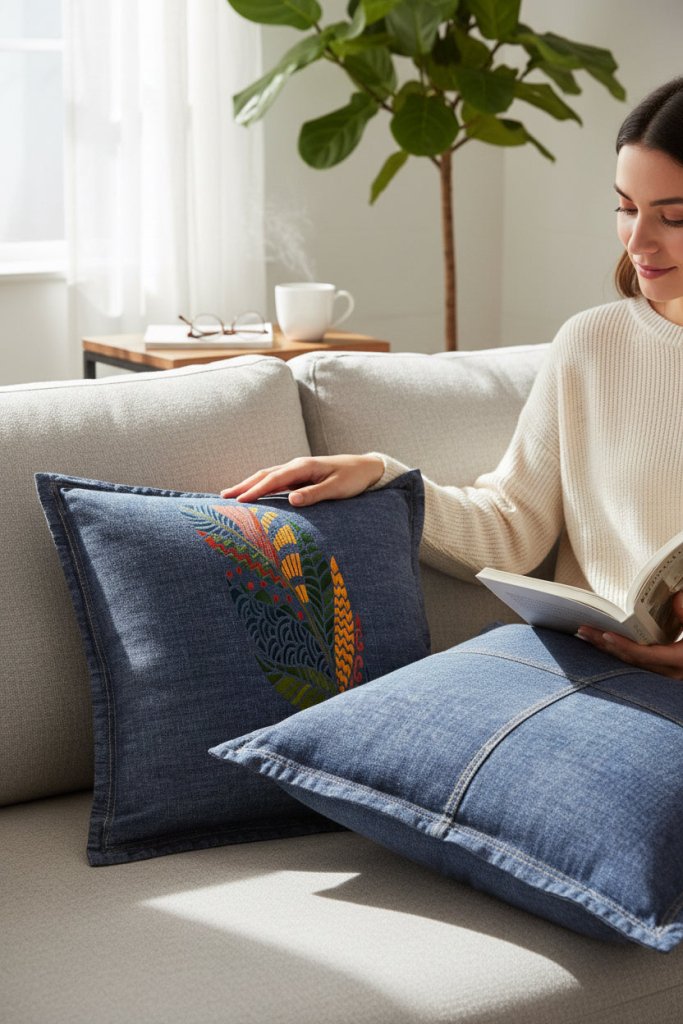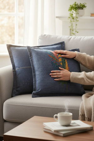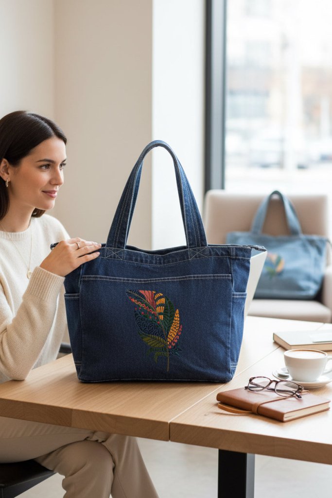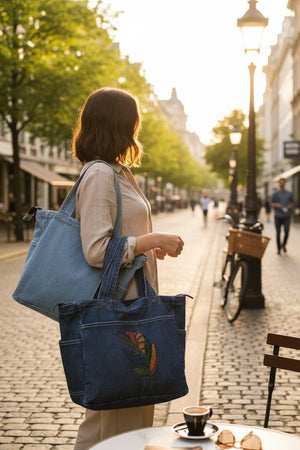 On black denim, the feather feels most at home. The background disappears entirely, allowing the colors to glow forward. Blues deepen, greens feel grounded, and yellows and reds ignite against the dark base. As the fabric folds, sections of the feather appear and vanish, reinforcing the sensation of movement.