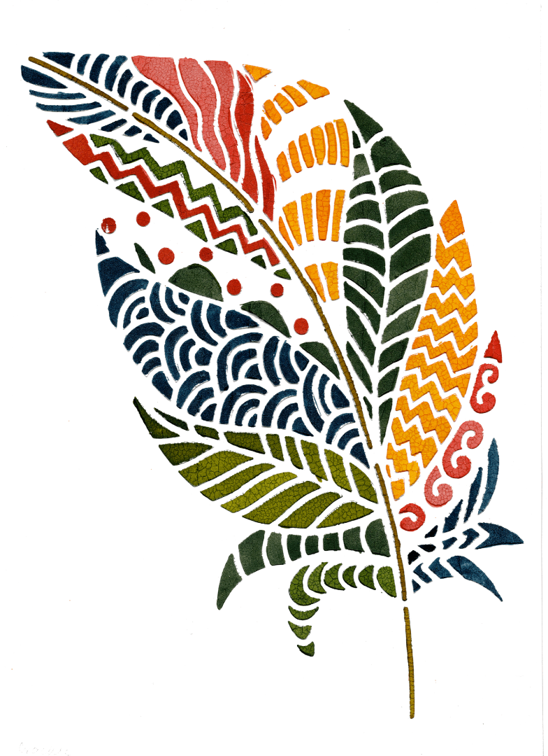 As your eye travels upward, the palette shifts. Mustard yellow and warm orange blocks appear in short vertical groupings, punctuated by zigzag lines that introduce energy and direction. Coral-red shapes curl and spiral near the right edge, softer and more playful, while small circular dots in red float near the center like pauses in the pattern. Each color field is bounded by soft edges rather than hard lines, as if pigment has soaked into paper before settling. On denim, these areas would sink into the twill at different depths, giving the feather a tactile, layered presence. It matters because the feather reads as constructed from many voices rather than a single gesture.