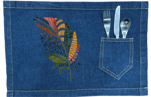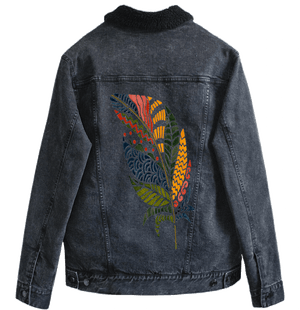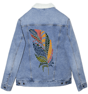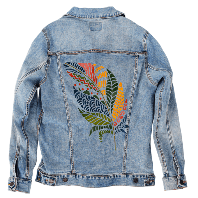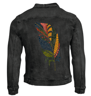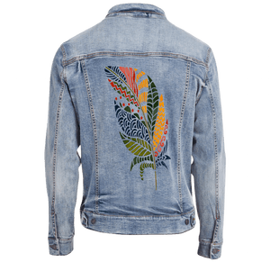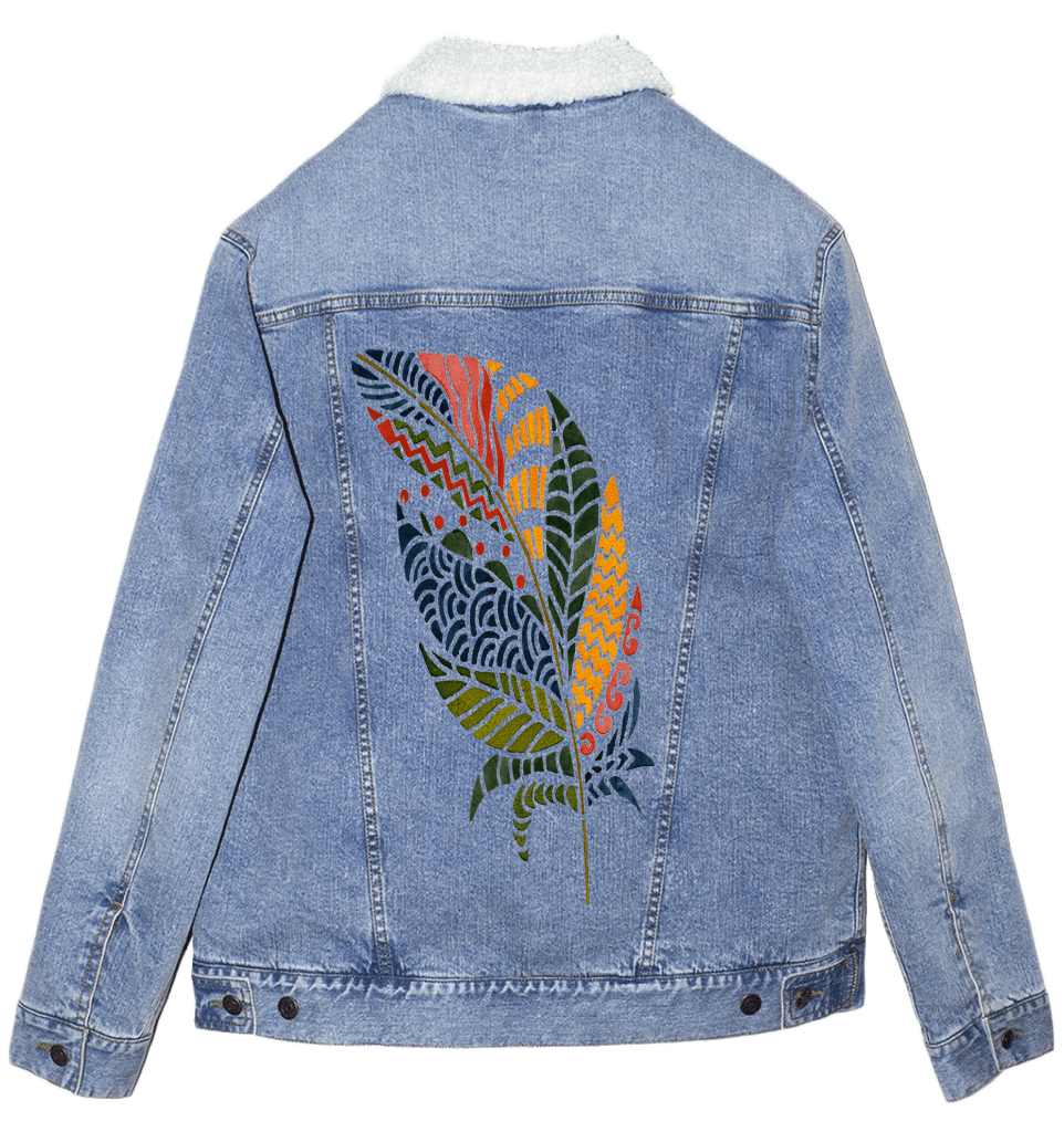 On white denim, clarity takes hold. Each color block separates cleanly, and the internal patterns become highly legible. The quill sharpens, and the feather reads as bold, graphic, and intentional. This clarity matters because it frames the artwork as expression — individuality made visible.