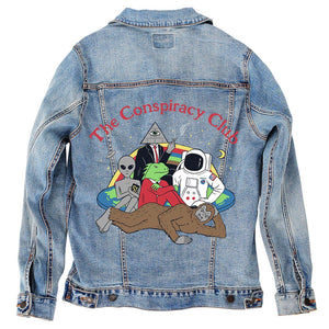 CONSPIRACY CLUB by Grant Shepley, digitally printed on a hand-made Denim Jacket with 3 color choices: Stonewash, White, or Black. Unisex XS S M L XL 2X 3X