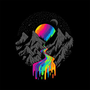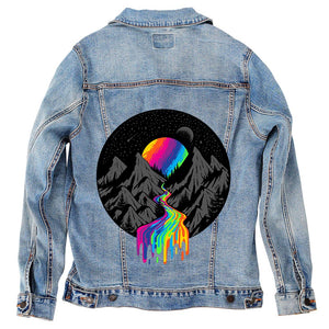COSMIC RIVER by Grant Shepley, digitally printed on a hand-made Denim Jacket with 3 color choices: Stonewash, White, or Black. Unisex XS S M L XL 2X 3X