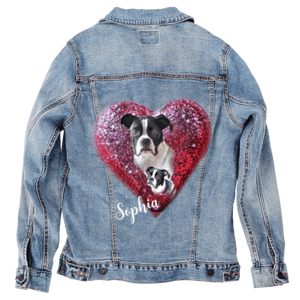 Custom Denim Jacket – Customer Designed – Dog Portraits in Red Glitter Heart with “Sophia” Text Back Art – 3 Color Choices (hand-crafted)