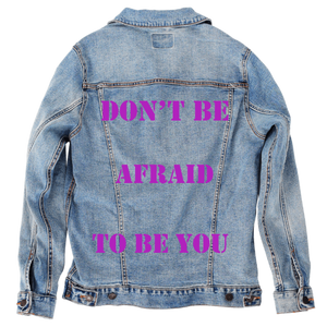 Custom Denim Jacket – Customer Designed – “Don’t Be Afraid To Be You” Purple Text Back Art – 3 Color Choices (hand-crafted)