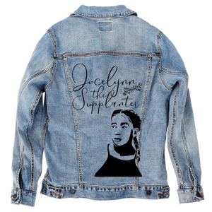 Custom Denim Jacket – Customer Designed – “Jocelynn the Supplanter” Text and Silhouette Portrait Back Art – 3 Color Choices (hand-crafted) | 1008