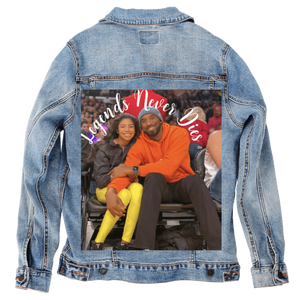 Custom Denim Jacket – Customer Designed – “Legends Never Dies” Text and Seated Duo Photo Back Art – 3 Color Choices (hand-crafted)