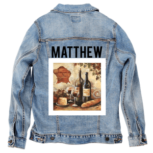 Custom Denim Jacket – Customer Designed – “MATTHEW” Text and Wine, Bread & Cheese Still-Life Back Art – 3 Color Choices (hand-crafted)