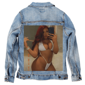 Custom Denim Jacket – Customer Designed – Mirror Selfie Woman in White Bikini Photo Back Art – 3 Color Choices (hand-crafted)