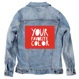 Custom Denim Jacket – Customer Designed – Red Block “Your Favorite Color” Text Back Art – 3 Color Choices (hand-crafted)