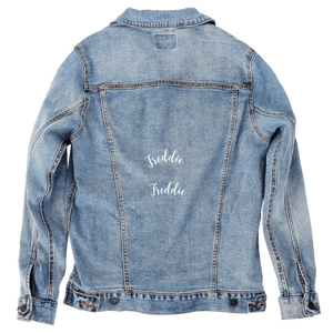 Custom Denim Jacket – Customer Designed – White Script “Freddie” Text Back Art – 3 Color Choices (hand-crafted)