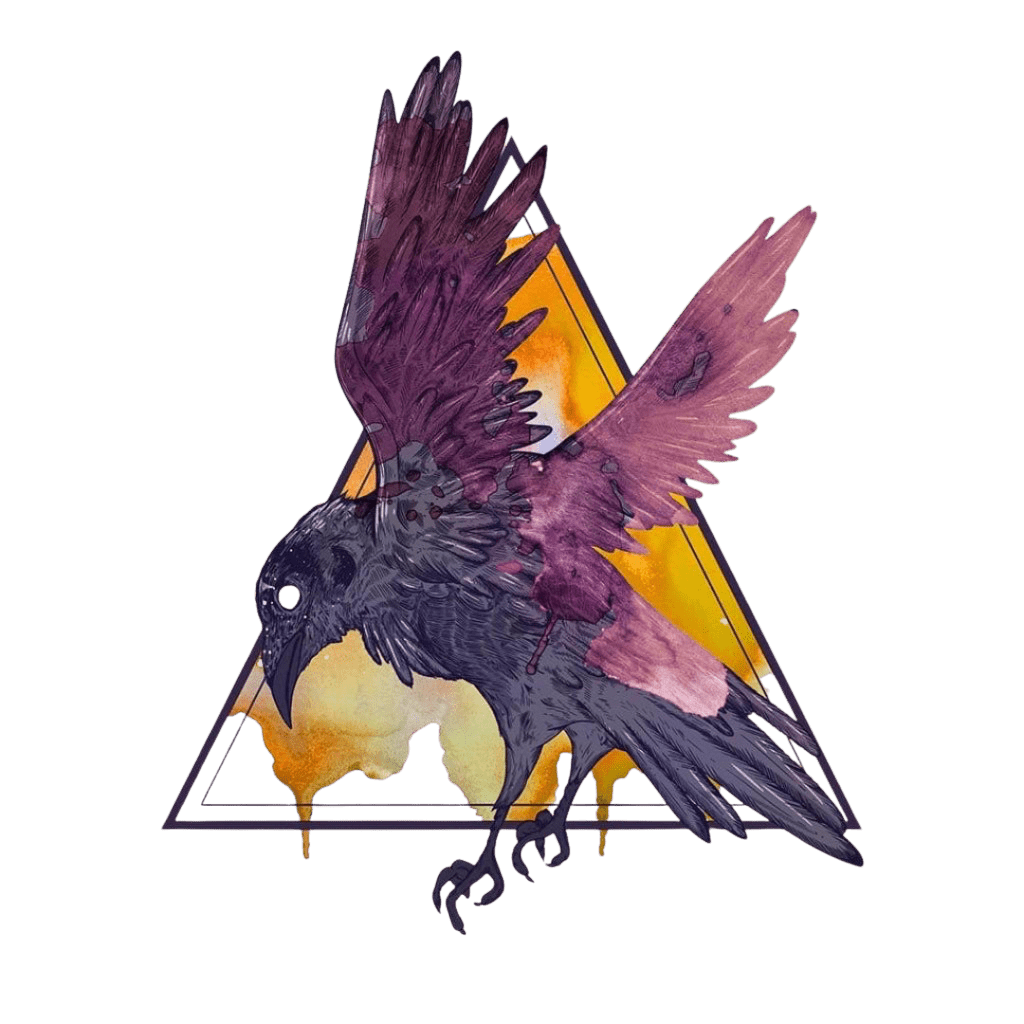 forming rounded drips that echo the feather drips above. The crow overlaps the