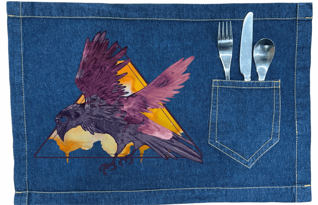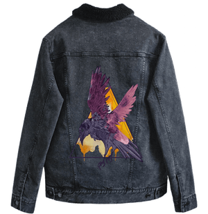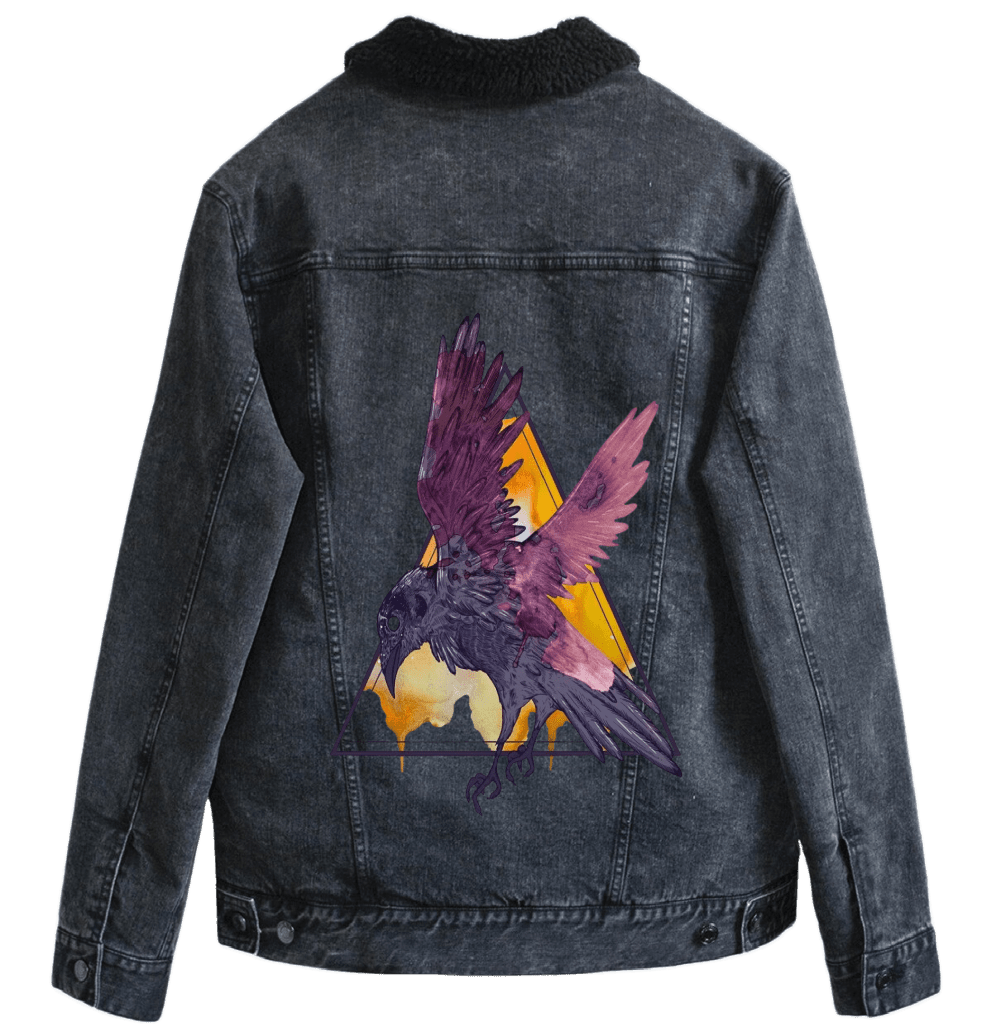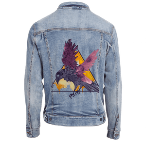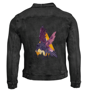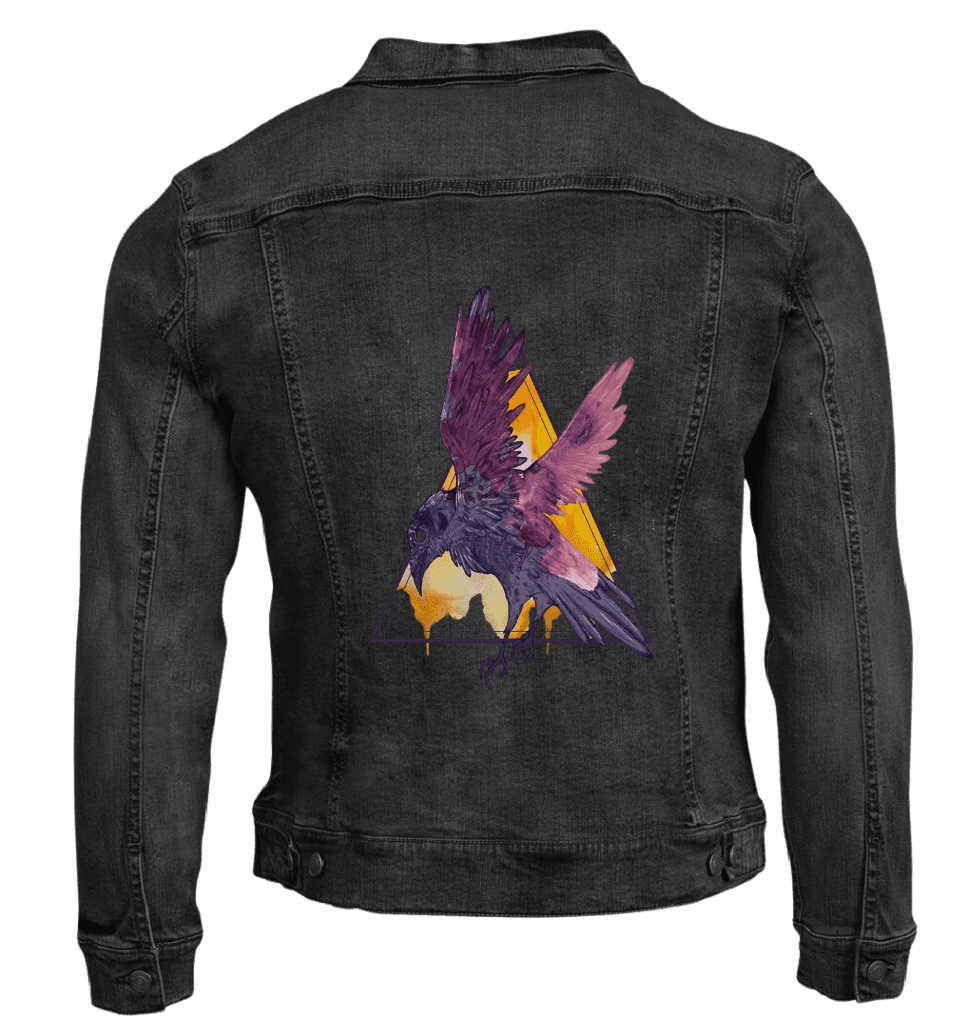 black denim, the piece turns cinematic. The crow’s dark body blends closely
