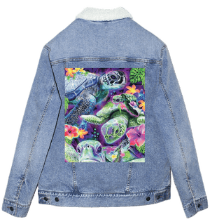 Stonewashed denim makes the turtles feel slower and closer, as if they’ve been swimming alongside the wearer for a long time, their motion absorbed into the fabric.