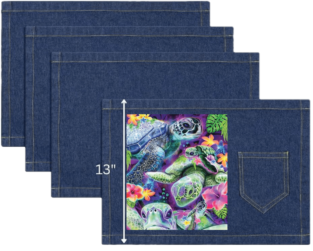 The tropical flowers pop vividly against the white base, their petals clearly separated and saturated. Overlapping turtles are easier to distinguish, and the directional flow of flippers and bodies becomes more pronounced. Emotionally, white denim presents the artwork as joyful and alive—a vivid underwater vision filled with color and motion.