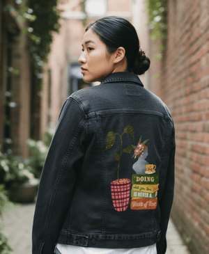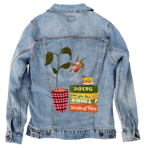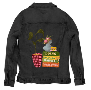 DOING WHAT YOU LOVE by THEARTICSOUL, digitally printed on a hand-made Denim Jacket with 3 color choices: Stonewash, White, or Black. Unisex XS S M L XL 2X 3X