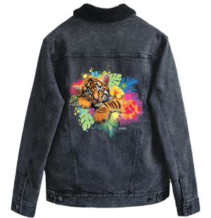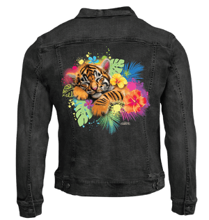 Black denim transforms Dreaming Tiger Cub into a powerful image of vulnerability protected by vibrancy — softness at the core, surrounded by life.