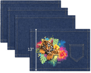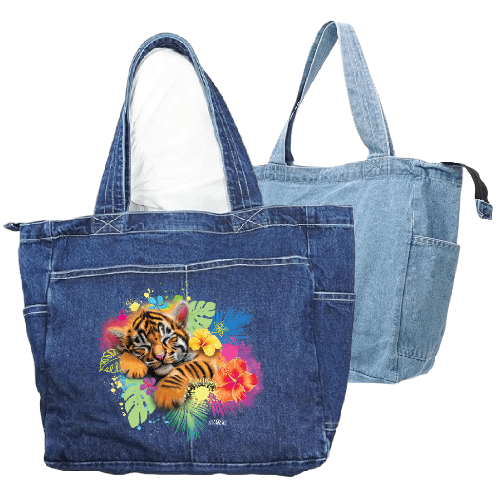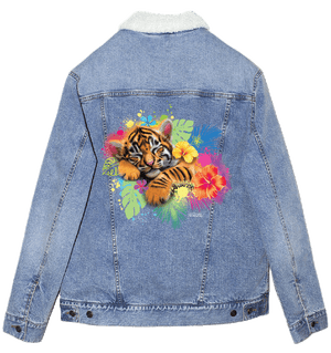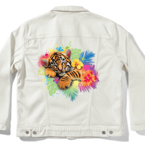 White denim presents Dreaming Tiger Cub as cheerful and expressive, balancing innocence with celebration.