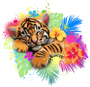 A sleeping tiger cub curled at the center with eyes closed and head resting on its forepaws. The cub’s orange and black striped fur is soft and detailed, with a pale muzzle and pink nose. It is surrounded by bright tropical flowers in yellow, orange, and coral, large green leaves, and splashes of neon paint in pink, blue, green, and yellow radiating outward against a black background. This artwork is titled “Dreaming Tiger Cub” and created by Sheena Pike