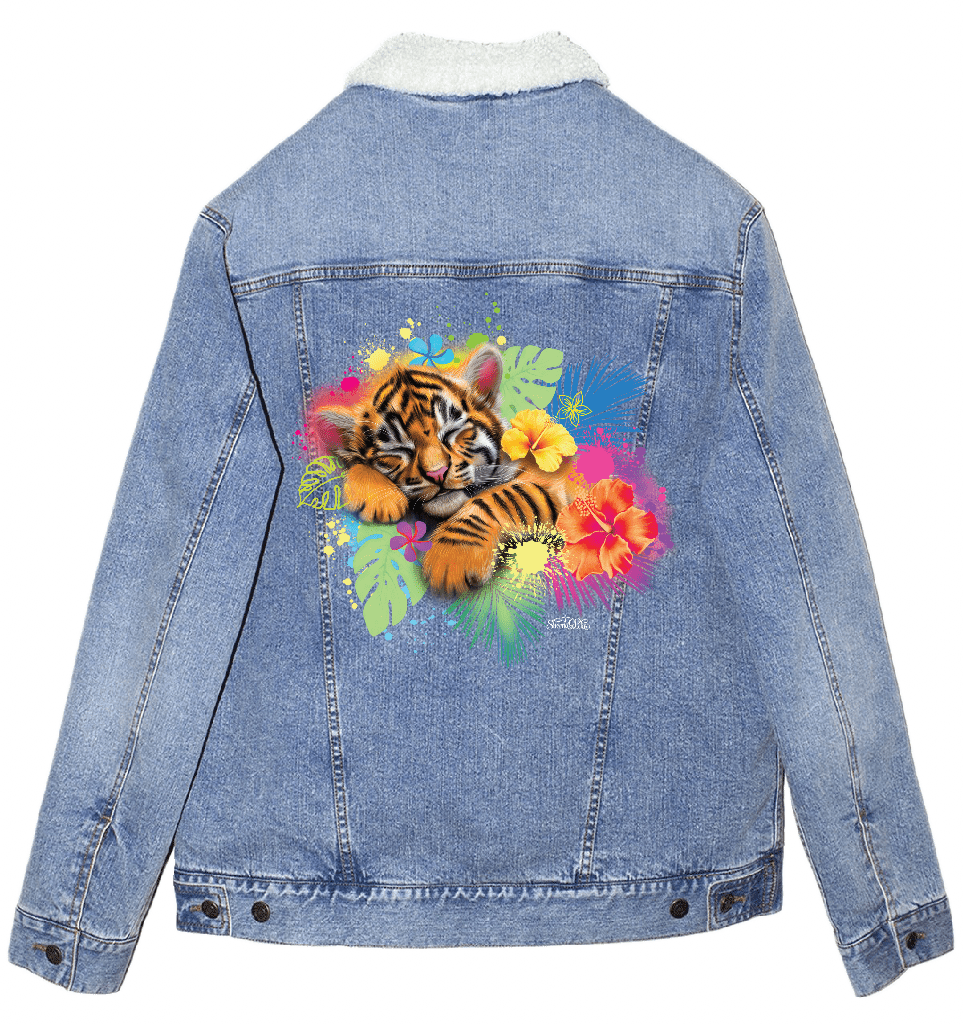 On stonewashed denim, the cub’s fur softens immediately. Orange tones mute slightly into warmer, sun-faded hues, and the black stripes blur gently into the twill. The neon splashes lose their sharp edges, becoming cloud-like stains rather than bursts. The overall feeling shifts toward nostalgia, as if the image has been carried and worn over time.