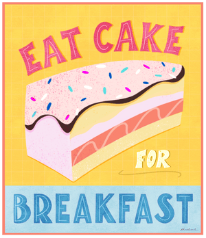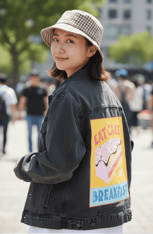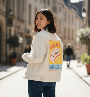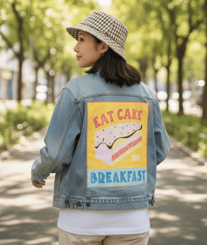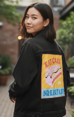 EAT CAKE FOR BREAKFAST by THEARTICSOUL, digitally printed on a hand-made Denim Jacket with 3 color choices: Stonewash, White, or Black. Unisex XS S M L XL 2X 3X
