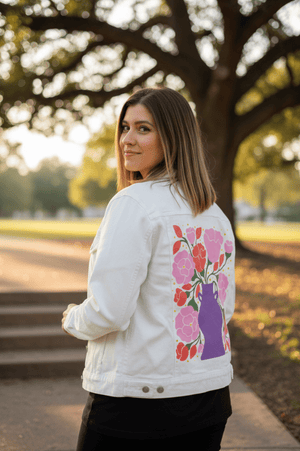 EMBER and BLUSH BOUQUET by INDYSIGN, digitally printed on a hand-made Denim Jacket with 3 color choices: Stonewash, White, or Black. Unisex XS S M L XL 2X 3X