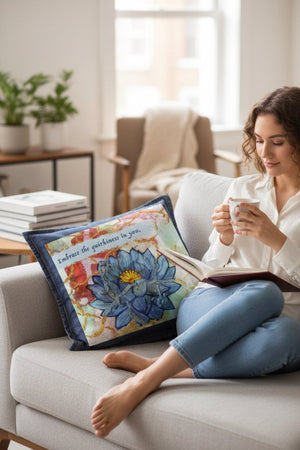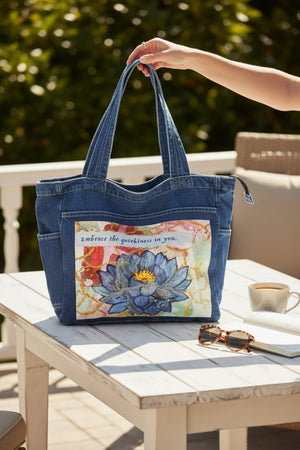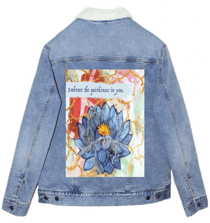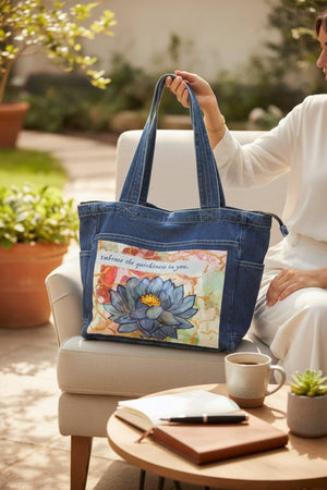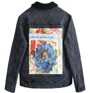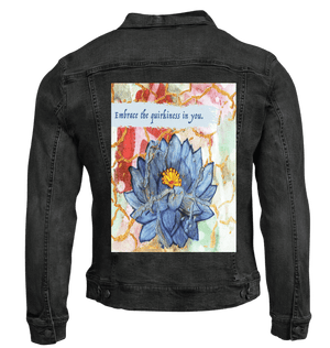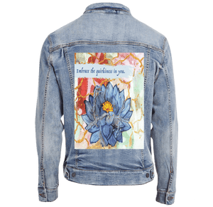 On stonewashed denim, the blues soften into velvety tones, and the gold cracks mellow into warm, embedded lines that feel aged and cherished. The background colors blur further, becoming atmospheric and memory-like. The lotus feels like something carried for a long time — repaired, revisited, and still opening.