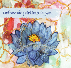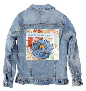 EMBRACE YOURSELF by CANVAS and QUOTATIONS, digitally printed on a hand-made Denim Jacket with 3 color choices: Stonewash, White, or Black. Unisex XS S M L XL 2X 3X.