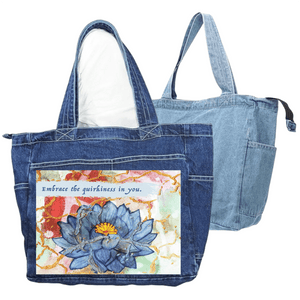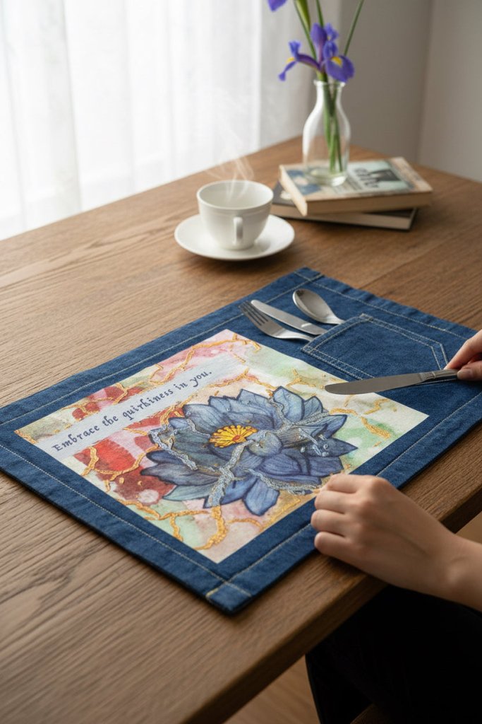 On white denim, clarity takes hold. The gold crack lines sharpen, the petal outlines become crisp, and the contrast between cool blue and warm yellow intensifies. The quirks read clearly as features, not accidents. This clarity matters because it frames difference as something seen openly and celebrated.