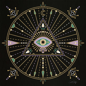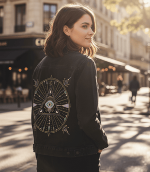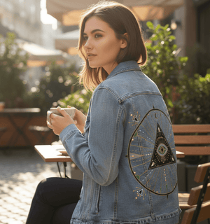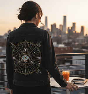 EVIL EYE MANDALA by Catcoq,digitally printed on a hand-made Denim Jacket with 3 color choices: Stonewash, White, or Black. Unisex XS S M L XL 2X 3X