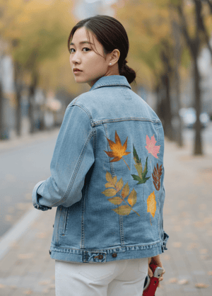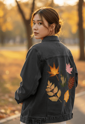 FALL LEAVES by THEARTICSOUL, digitally printed on a hand-made Denim Jacket with 3 color choices: Stonewash, White, or Black. Unisex XS S M L XL 2X 3X