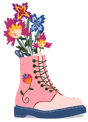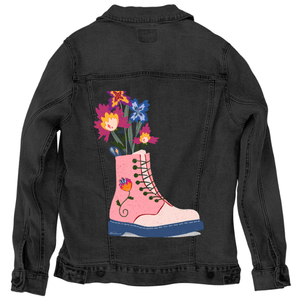 FLORAL BOOTS by THEARTICSOUL, digitally printed on a hand-made Denim Jacket with 3 color choices: Stonewash, White, or Black. Unisex XS S M L XL 2X 3X