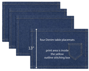 Also printed on other DENIM products: throw pillows, aprons, table place mats.