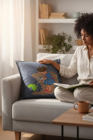 dissolves into the fabric, allowing the girl, the watering can, and the green