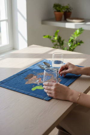 stonewashed denim, the scene softens into reflection. The green of the plant