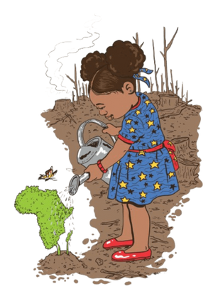 the African continent. she pours water from a silver watering can onto the