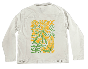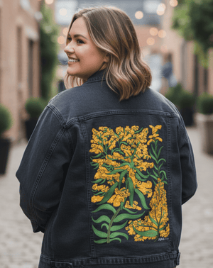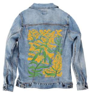 GOLDENROD by KITSCH AND CURATE, digitally printed on a hand-made Denim Jacket with 3 color choices: Stonewash, White, or Black. Unisex XS S M L XL 2X 3X