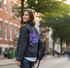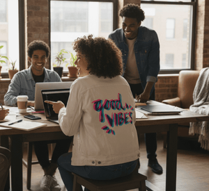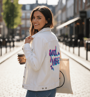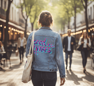 GOOD VIBES by Catcoq,digitally printed on a hand-made Denim Jacket with 3 color choices: Stonewash, White, or Black. Unisex XS S M L XL 2X 3X