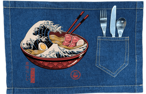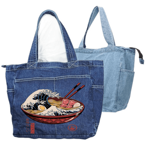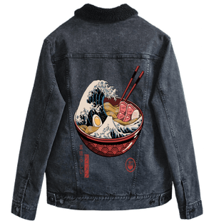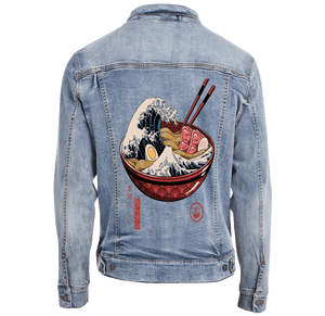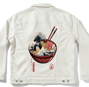 Emotionally, black denim transforms Great Ramen Wave into a bold nocturnal emblem—powerful, indulgent, and theatrical—where motion and appetite collide in a single, unforgettable image held close against darkness.