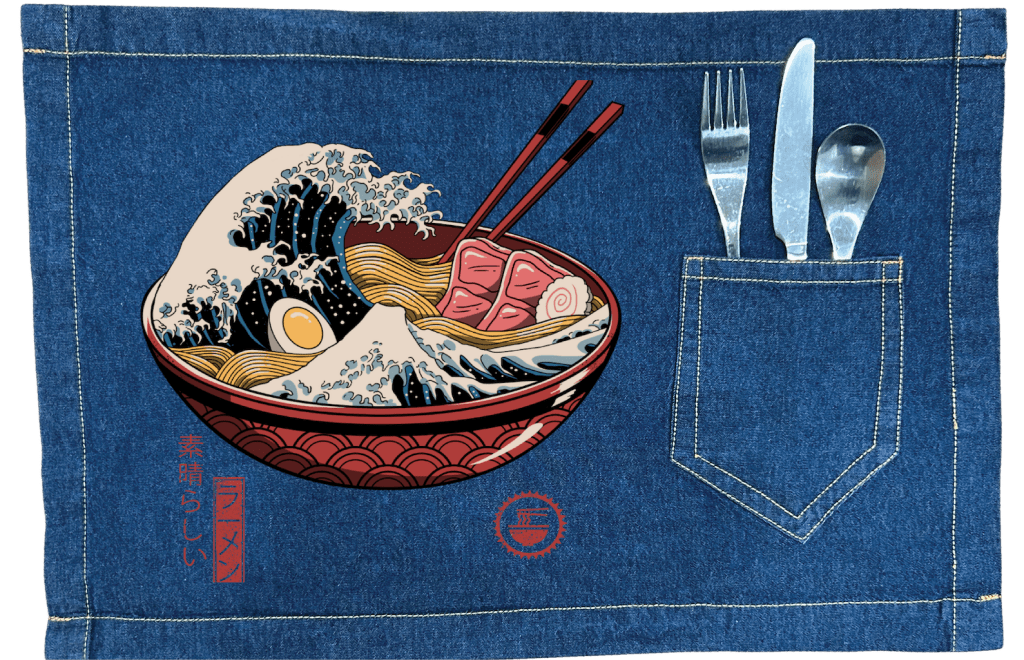 On white denim, clarity takes hold. The wave’s foam becomes sharply defined, each curl and spray legible. The noodles snap into crisp parallel lines, and the egg yolk glows vividly. The red bowl pattern reads clean and graphic, and the chopsticks stand out boldly.