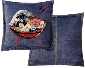 On stonewashed denim, the wave softens into something atmospheric. Blues and whites diffuse into the fabric grain, foam edges rounding and blending. The noodles deepen into warmer golds, their separation less crisp but more cohesive. The red bowl becomes slightly muted, reading as worn ceramic rather than glossy lacquer.