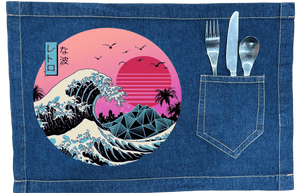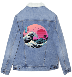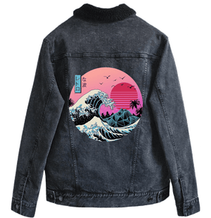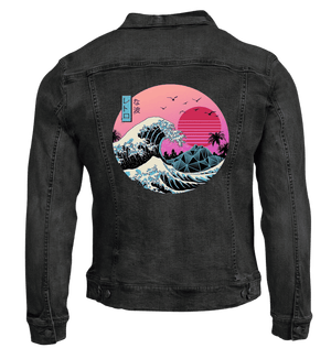 On stonewashed denim, the colors soften into nostalgia. The pink sky diffuses into warmer tones, and the red sun loses sharp banding, becoming more atmospheric. The wave’s foam blends into the denim grain, rounding its edges and reducing contrast between black water and white spray.