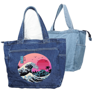 On white denim, clarity takes command. The wave’s black-and-white contrast sharpens, each foam claw clearly defined. The pink sky and red sun pop vividly, their horizontal lines clean and graphic. The skyline and mountain read distinctly, emphasizing the collision of nature, city, and design.