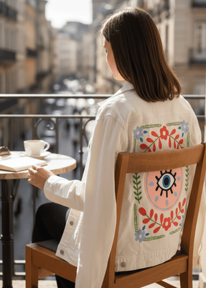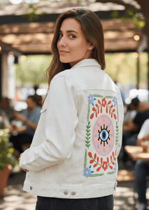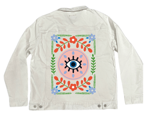 GUARDED by HEND SHEHATA, digitally printed on a hand-made Denim Jacket with 3 color choices: Stonewash, White, or Black. Unisex XS S M L XL 2X 3X